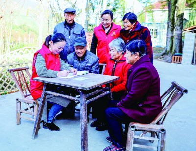 浙江長興縣和平鎮(zhèn)方家莊村便民服務中心志愿者為村里老人上門辦理第三代社??〒Q證業(yè)務。新華社發(fā)