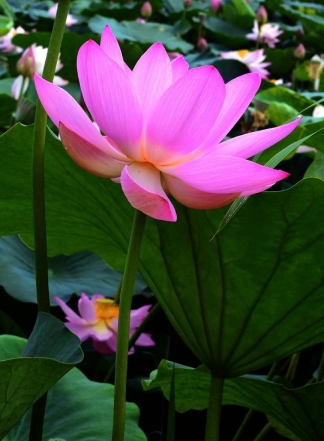 荷花凋謝前,花中心蕊開始長蓮蓬。秋天花瓣脫落,便留下蓮蓬,形狀似漏斗。蓬內(nèi)長著蓮子,成熟后顆顆飽滿凸起。荷梗是一枝中空管狀長梗,其外表生毛刺。荷花、荷蓋、蓮蓬都長在梗的頂端,夏天干挺,秋后干扁,并會(huì)曲折而斷。尖葉是葉蓋的初長之葉,兩頭尖,卷曲成筒形,梗短而細(xì)小,很優(yōu)美。