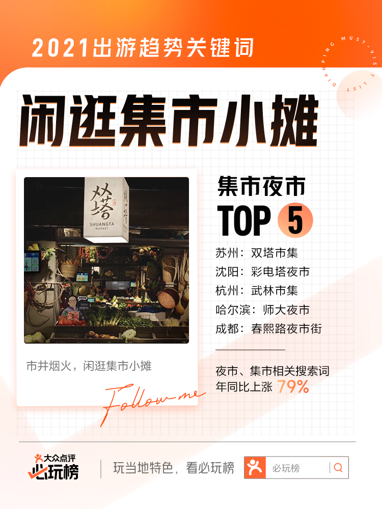 “市井煙火氣,最撫凡人心”,夜市、集市拓寬游客游玩半徑,為深度探索城市提供了更多可能。據(jù)“必玩榜”數(shù)據(jù)顯示,夜市、集市相關搜索詞年同比上漲79%,其中哈爾濱的師大夜市與蘇州的雙塔市集、沈陽的彩電塔夜市、杭州的武林市集、成都的春熙路夜市街共同入選全國TOP5熱門集市夜市。