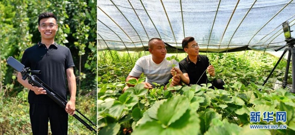 拼版照片:左圖為張成蘊在山西省運城市絳縣臨澮村的田間;右圖為張成蘊(右)在大棚里錄制農(nóng)業(yè)科普視頻(7月14日攝)。今年34歲的張成蘊大學畢業(yè)后,一直熱衷于用拍攝視頻的方式宣傳家鄉(xiāng)的風土人情。2018年8月,他開始在社交平臺上幫助鄉(xiāng)親們直播帶貨,真誠的笑容、優(yōu)質的產(chǎn)品和專業(yè)的知識是他吸引粉絲的“訣竅”。