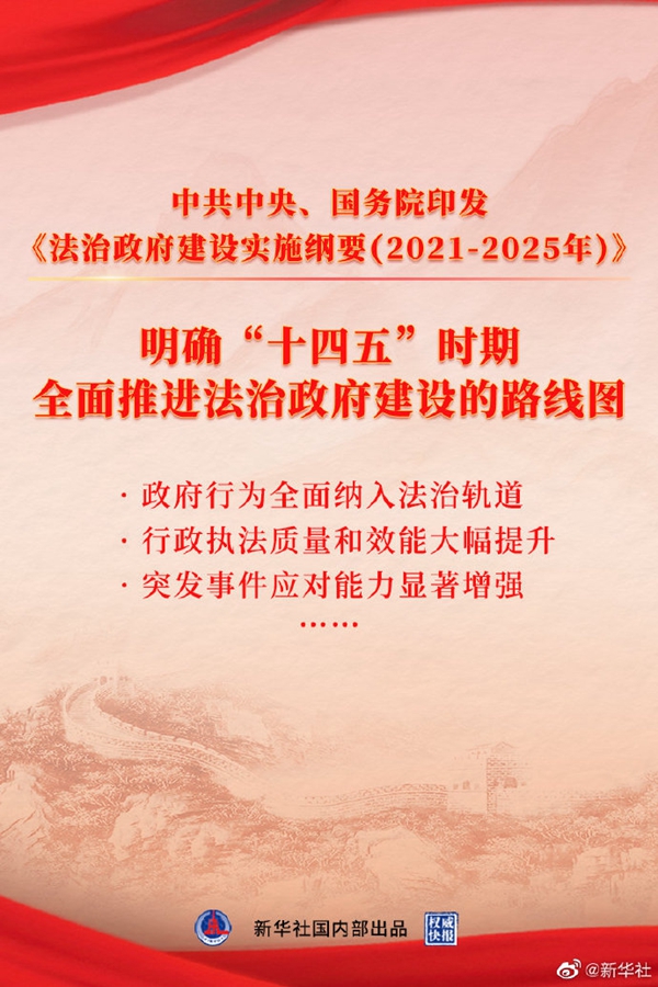 中共中央、國(guó)務(wù)院近日印發(fā)的《法治政府建設(shè)實(shí)施綱要(2021——2025年)》確立了今后五年法治政府建設(shè)的總體目標(biāo),明確到2025年,政府行為要全面納入法治軌道。綱要還提出,著力實(shí)現(xiàn)行政執(zhí)法水平普遍提升,努力讓人民群眾在每一個(gè)執(zhí)法行為中都能看到風(fēng)清氣正、從每一項(xiàng)執(zhí)法決定中都能感受到公平正義。(新華社記者白陽 海報(bào)設(shè)計(jì)楊軼群)
