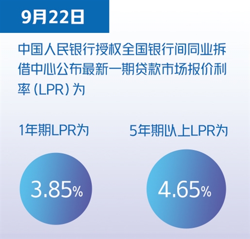 9月22日,中國人民銀行授權(quán)全國銀行間同業(yè)拆借中心公布最新一期貸款市場報(bào)價(jià)利率(LPR)為:1年期LPR為3.85%,5年期以上LPR為4.65%。兩項(xiàng)貸款市場報(bào)價(jià)利率均連續(xù)18個(gè)月保持這一水平。
