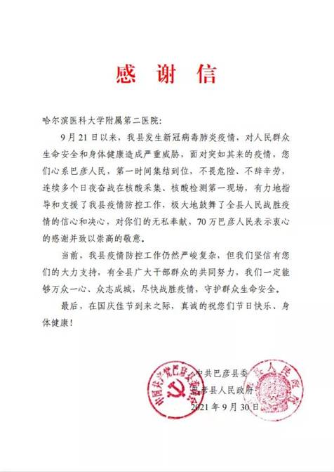黑龍江經濟網訊(黑龍江日報全媒體見習記者董廣碩 商祺)近日,哈爾濱醫(yī)科大學附屬一院、二院、腫瘤醫(yī)院、四院分別收到巴彥縣委縣政府的感謝信,感謝他們“有力地指導和支援了我縣疫情防控工作,極大地鼓舞了全縣人民戰(zhàn)勝疫情的信心和決心?!?/span>
