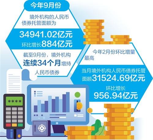 境外機(jī)構(gòu)對人民幣債券熱情持續(xù)高漲。數(shù)據(jù)顯示,9月份境外機(jī)構(gòu)人民幣債券托管面額為34941.02億元,較8月份增加884億元,環(huán)比增量創(chuàng)今年3月份以來新高。截至9月份,境外機(jī)構(gòu)已連續(xù)34個(gè)月增持人民幣債券。