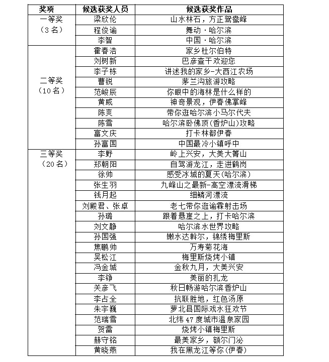 黑龍江文化旅游短視頻新媒體營銷創(chuàng)作大賽獲獎名單