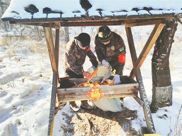 同一時(shí)間,青山林場(chǎng)的巡護(hù)隊(duì)員來(lái)到53林班補(bǔ)飼點(diǎn),貼福字,送“年貨”?!斑@過(guò)年了,狍子野豬的食物也得提檔升級(jí)。咱們過(guò)年吃餃子,它們也得吃點(diǎn)好的?!标?duì)員王振林邊擺放著玉米、豆餅粉、白菜、蘿卜等食物邊調(diào)侃著。