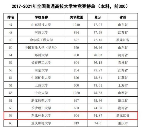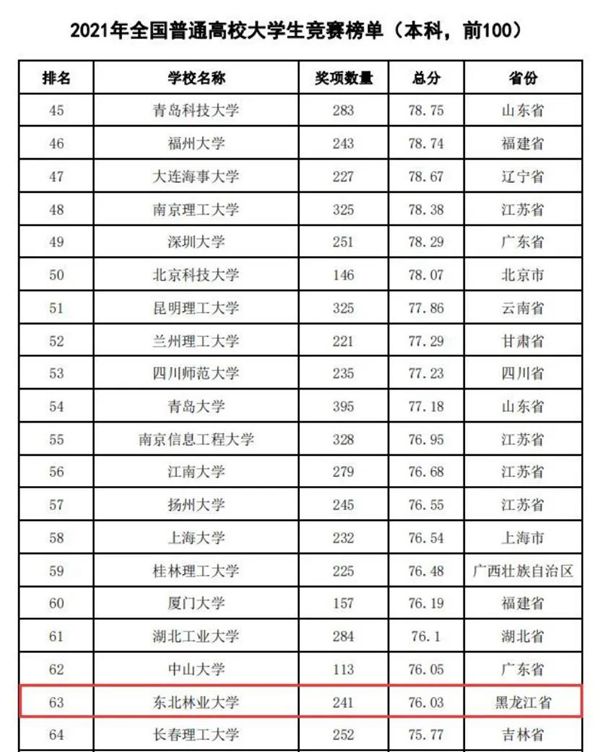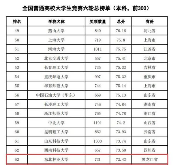 據(jù)悉,中國(guó)高等教育學(xué)會(huì)自2017年2月啟動(dòng)《高校競(jìng)賽評(píng)估與管理體系研究》項(xiàng)目以來(lái),中國(guó)高等教育學(xué)會(huì)已經(jīng)連續(xù)發(fā)布六輪榜單,這是我國(guó)第一個(gè)專注高校創(chuàng)新人才培養(yǎng)暨學(xué)科競(jìng)賽成果的排行榜,是檢驗(yàn)高校人才培養(yǎng)質(zhì)量的重要途徑。為從更長(zhǎng)的時(shí)間段了解各高校大學(xué)生競(jìng)賽發(fā)展態(tài)勢(shì),特在今年發(fā)布了“六輪總榜單”,時(shí)間跨度從2012年到2021年,東北林業(yè)大學(xué)以總分73.42,位列全國(guó)第63位。