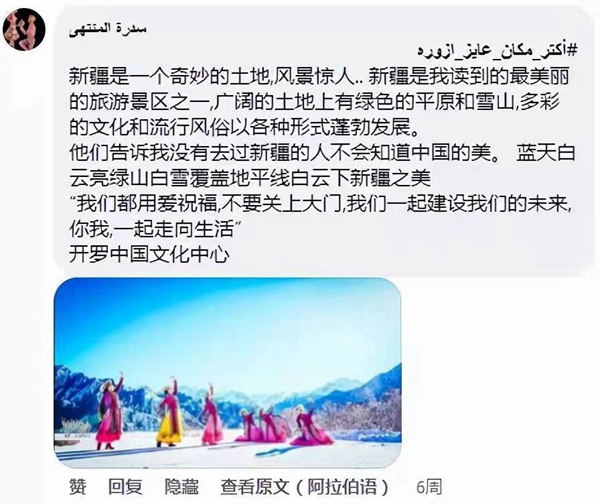 其中,來(lái)自埃及曼蘇拉的西德拉·蒙塔哈獲得本次活動(dòng)的“最佳評(píng)論獎(jiǎng)”。她在中心帖文下多次留言,“新疆風(fēng)景迷人,是最美的旅游勝地之一。在廣袤的土地上有草原和雪山,沒(méi)有去過(guò)新疆的人,就不會(huì)知道中國(guó)的美……我想去那里滑雪、騎馬。”另外,她還想去北京吃炸醬面,去遼寧泡溫泉等。