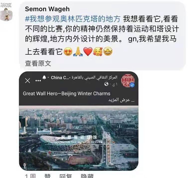 2022年年初,根據(jù)埃及社會(huì)、文化特點(diǎn)和民眾喜好,開(kāi)羅中國(guó)文化中心創(chuàng)新推出了2022“北方冰雪旅游海外推廣季”之“我最想去的地方”線上評(píng)選活動(dòng),邀請(qǐng)埃及各界友人參與話題互動(dòng),在中心主題帖文下寫出自己最想去的中國(guó)省份(或城市)及原因,曬出旅游目的地圖片并打上話題標(biāo)簽等?;顒?dòng)一經(jīng)推出,即受到埃及民眾的廣泛關(guān)注,網(wǎng)友們紛紛在中心臉書帖文下留言并轉(zhuǎn)發(fā),評(píng)選自己“最想去的中國(guó)冰雪旅游勝地”,并熱情附上自己之前在華留學(xué)、訪問(wèn)、旅游、生活的旅游體驗(yàn)和文化閱歷,活動(dòng)二次外溢效應(yīng)明顯,二次傳播效果良好,旅游推廣和文化傳播的效果遠(yuǎn)遠(yuǎn)高于預(yù)期?;顒?dòng)期間,該活動(dòng)