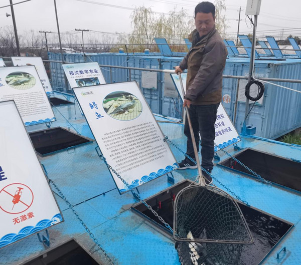 在良莊農(nóng)業(yè)科技園里,一排排藍(lán)色集裝箱,以及寫著“養(yǎng)殖箱體全程模擬自然生態(tài)環(huán)境,還您江湖魚的味道”等字樣的標(biāo)牌,別有一番趣味。記者了解到,這里是一個智慧漁場,裝滿水的集裝箱則是鱘魚、鱸魚、鯽魚等的“家園”,打開一個集裝箱的頂部,三五成群的魚兒在約15平方米的水里游來游去。