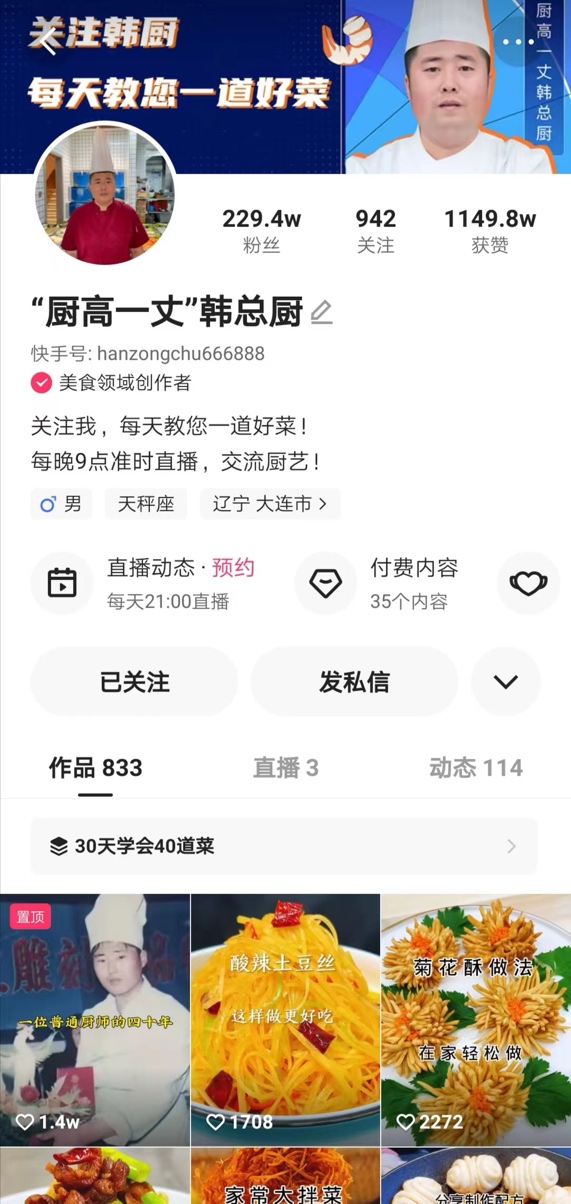 “我只想踏踏實(shí)實(shí)地教大家做菜,粉絲們只要跟著我的課程一步步做,做出的菜品味道絕不會(huì)差。”從滿足粉絲的需求出發(fā),韓總廚憑借一條條制作精良、干貨滿滿的視頻課程,積累了229.4萬粉絲,榮升成粉絲心目中的“老大”。