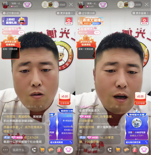將每日準(zhǔn)備的“菜譜”分享完后,韓總廚還會(huì)在直播間和粉絲們談心聊天?!凹议L(zhǎng)里短的事兒我們也都會(huì)聊,大家的氛圍很好,也都不受拘束?!睂?duì)于韓總廚和粉絲們來說,快手不僅是交流分享美食秘訣的平臺(tái),更是朋友間無話不談的情感交流地。