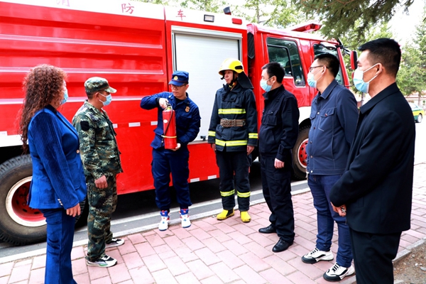 阿木爾林業(yè)局城鎮(zhèn)消防大隊戰(zhàn)斗員為干部職工講解滅火器的正確使用方法(王力 攝)