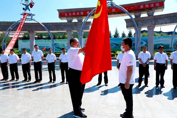 青年黨員母立巖手舉黨旗健步跑向藍(lán)莓廣場(chǎng)主席臺(tái),把黨旗交到了林業(yè)局黨委書記胡守慶手中,胡守慶揮舞黨旗,臺(tái)下黨員齊聲說(shuō)道:“不忘初心、牢記使命”。