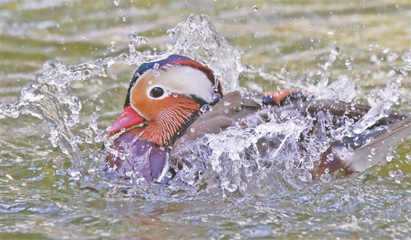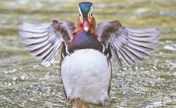 每天早晚,車春虎都會把準備好的麻籽、玉米、面包蟲等鳥食撒到湖上、岸邊,鴛鴦撒著歡覓食。吃完食兒,它們不時水上舒展羽翅,撲騰戲水,湖面上水花四濺,生機盎然。車春虎介紹,這些鴛鴦正在為南遷越冬做著體能儲備,每年10月中下旬它們就會離開繁殖地哈爾濱,飛到溫暖的南方越冬。