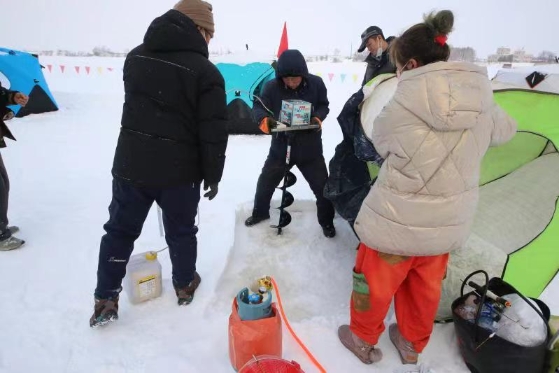 “龍行雪野”朔風(fēng)吹,游人“共釣寒江雪”。開幕式結(jié)束后,嘉蔭縣“休閑漁業(yè)”冰釣歡樂賽在嘉蔭永安東湖正式開始。平靜的冰面上,冰釣愛好者在支好的帳篷里有條不紊地生起暖爐、鑿開冰面、下好魚餌,靜等魚鉤跳動。隆冬時(shí)節(jié),冰雪蓋地、魚潛深水,冰釣愛好者以釣技論英雄,共享冰雪歡樂盛宴。