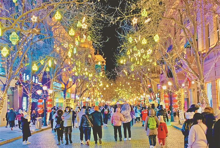 穿過歐式建筑,滿滿冰城風(fēng)情的彩燈以及年味十足的大紅燈籠將哈爾濱中央大街點亮。2023年新年伊始,百年老街呈現(xiàn)出游人如織的火熱場面,熟悉又熱鬧的氣氛彌漫在老街的各個角落,煙火氣持續(xù)升騰。欣賞唯美的陽臺音樂秀,品嘗鍋包肉、馬迭爾冰棍等特色美食,打卡“星空燈”、“雪妮妮網(wǎng)紅兔子”雪雕……游客和市民沉浸在一個個融合創(chuàng)意與冰城特色的冰雪玩法和體驗之中,盡情享受冰雪帶來的歡樂。數(shù)據(jù)顯示,僅春節(jié)期間,中央大街日均客流量維持在40萬人次,高峰時期達到70余萬人次。