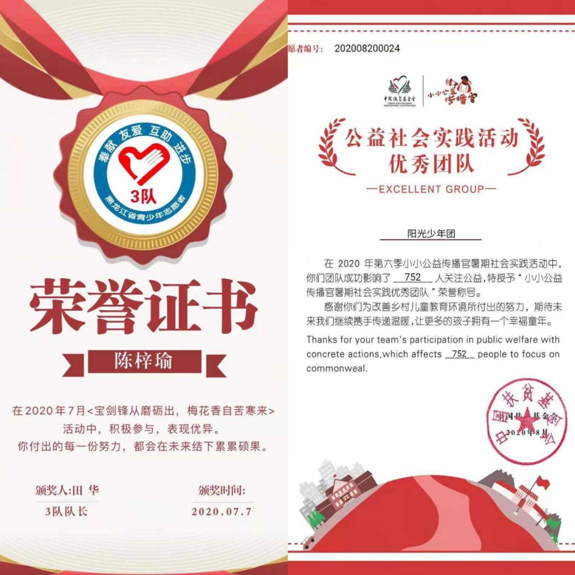 她在志愿服務(wù)中不怕苦不怕累,圓滿完成各項(xiàng)任務(wù),獲得各界一致好評(píng),先后獲得省市(區(qū))的相關(guān)表彰,并被省幫扶中心授予“愛心少年”榮譽(yù)稱號(hào)。