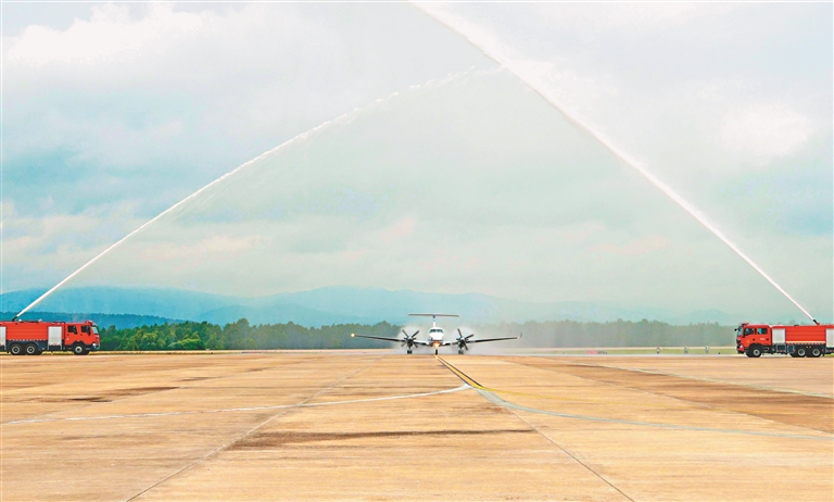 伴隨著飛機(jī)的轟鳴聲,命名為“林都號(hào)”的國(guó)王350飛機(jī)平穩(wěn)降落林都伊春,緩緩駛向林都機(jī)場(chǎng)5號(hào)停機(jī)坪。當(dāng)飛機(jī)落地脫離跑道后,左右兩側(cè)的消防車開始噴射水霧,兩束水霧相互交錯(cuò),以“水門禮”熱烈歡迎乘坐“林都號(hào)”來伊春的游客。