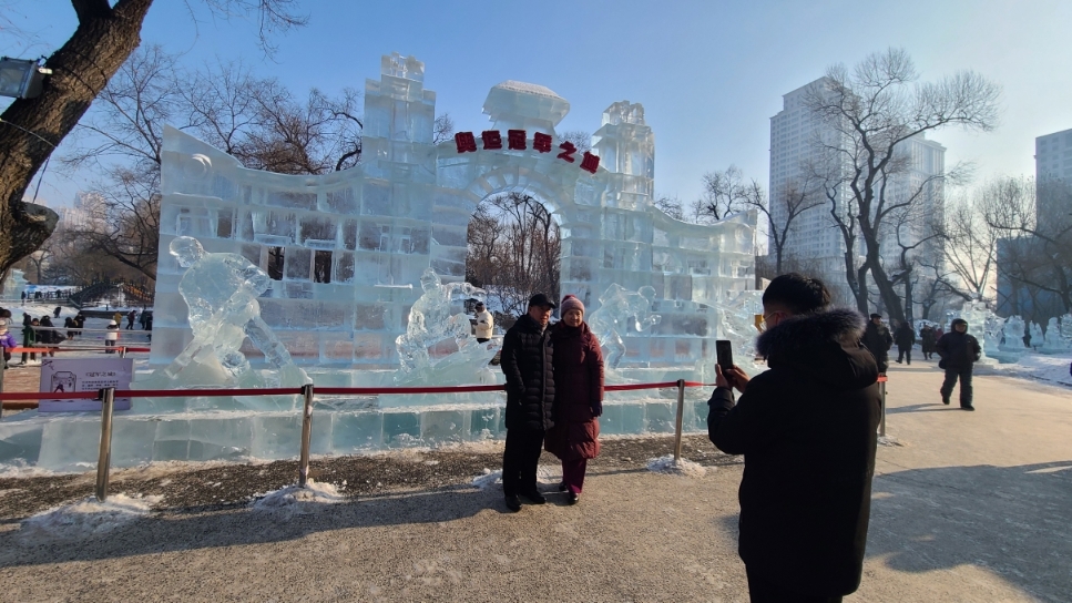 游客在哈爾濱松花江冰雪嘉年華園區(qū)大門前合影