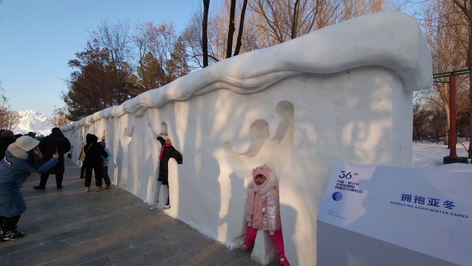 在斯大林公園沿線,記者看到一面展示全省冰雪體育成果的雪墻。雪墻上布置了展板,展示了包含第九屆亞冬會籌備情況、我省冰雪全民健身成果、省內(nèi)各地市歷年來冰雪運動及賽事發(fā)展情況等內(nèi)容。