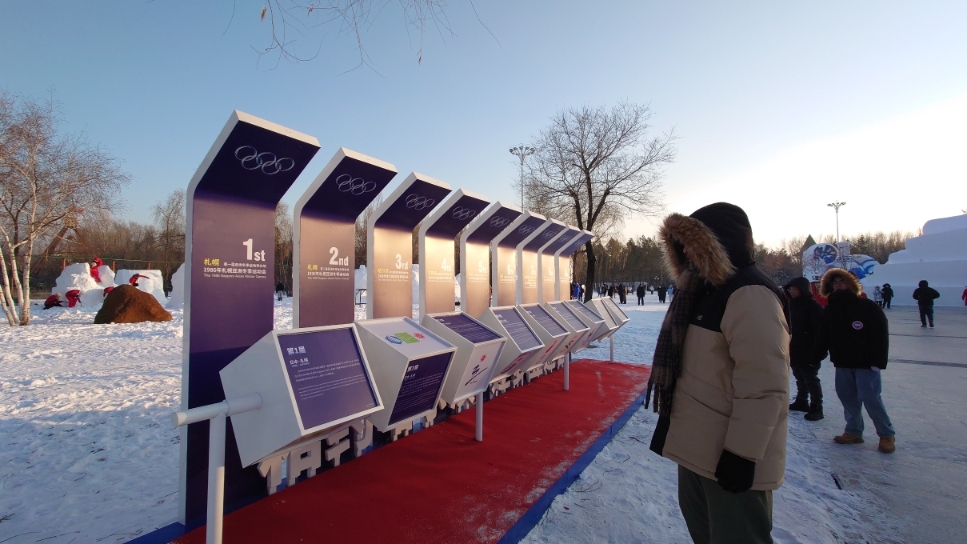 水閣云天附近,有一處歷屆亞冬會展示區(qū)。該展示區(qū)設(shè)置了9個可以旋轉(zhuǎn)的方塊,方塊上面分別介紹了從第一屆到將于2025年舉辦的第九屆亞冬會的概況。記者看到,不時有游客駐足瀏覽,了解亞冬會的舉辦歷史。