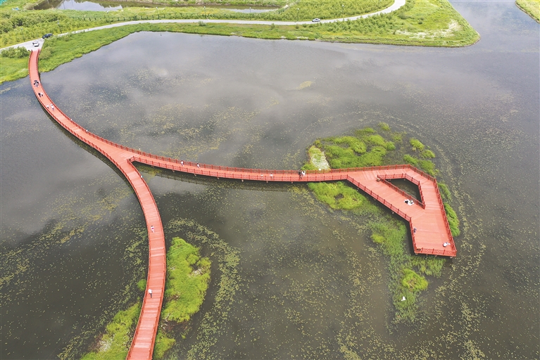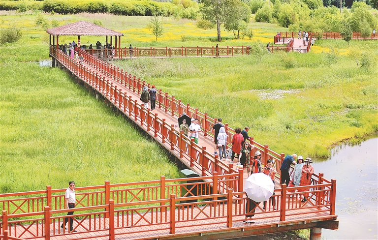 10日,哈爾濱市群力外灘濕地公園內(nèi),許多市民前來踏青游玩。持續(xù)多日的降雨,使得濕地內(nèi)的植物生長得更加茂盛,綠樹如茵、芳草遍地。人們有的走上蜿蜒的棧道觀賞野生鳥類和各種水生植物,有的坐在亭臺里休憩、野餐。孩子們在草地上奔跑著、歡笑著,享受踏青帶來的快樂。