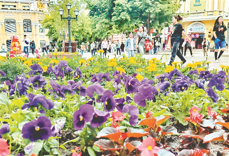 13日,哈爾濱市道里區(qū)中央大街上,行人從五彩繽紛的花卉旁走過。進(jìn)入夏季,來哈爾濱避暑游玩的游客不斷增多,為給游客打造一個(gè)舒適美麗的旅游環(huán)境,中央大街上種植了三色堇、金魚草、矮牽牛、四季海棠等多種花卉。這些鮮花姹紫嫣紅、爭(zhēng)奇斗艷,將整條街道裝點(diǎn)得十分靚麗。