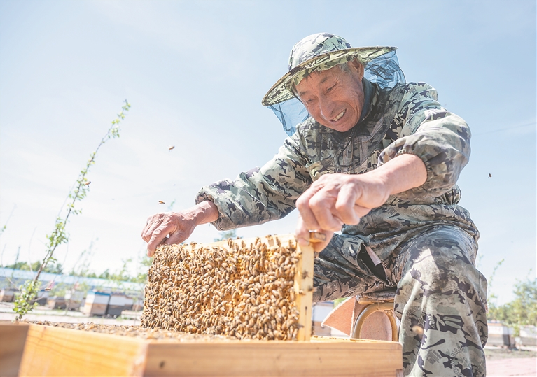 盛夏,草木蔥蘢、百花盛開,正是蜜蜂采蜜的好時節(jié)。走進(jìn)齊齊哈爾市克東縣東興林場,上百箱規(guī)格統(tǒng)一的木質(zhì)蜂箱整齊排列,蜂箱周圍,勤勞的蜜蜂們正忙碌地搬運著甜蜜果實,發(fā)出嗡嗡的聲響。