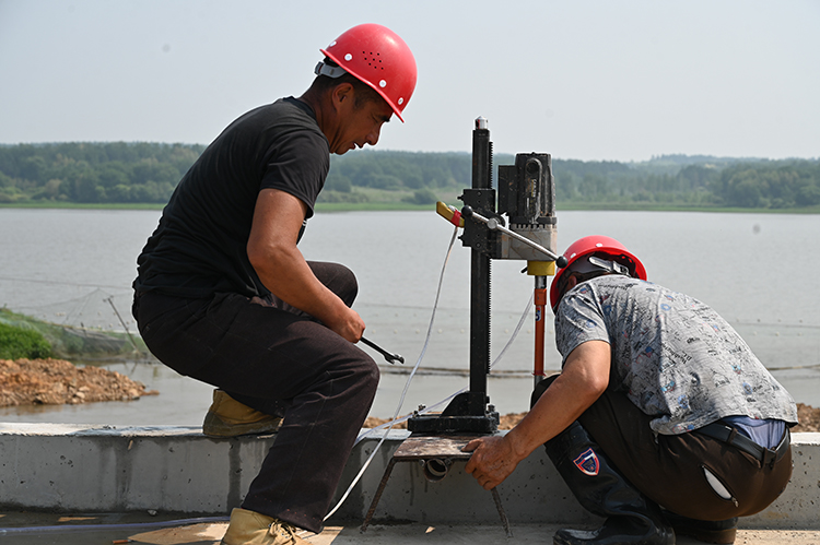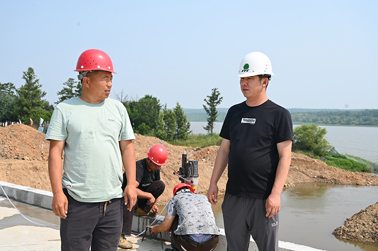 在引龍河農(nóng)場有限公司青年水庫除險加固工程施工現(xiàn)場,機器轟鳴,施工現(xiàn)場對大壩固腳及安全圍欄施工作業(yè),增強壩基防滲能力,消除大壩防洪隱患。同時與施工、設計部門一同研究,采用增設防滲膜圍堰措施,加快施工進度,制定了趕工計劃,倒排工期,確保汛限水位以下部分在主汛期來臨前全部完成。此外,現(xiàn)場還有督導組對水庫除險加固工程進行檢查。