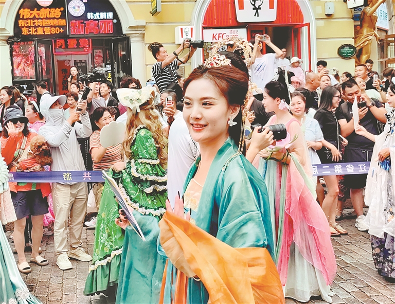 14日下午,哈爾濱市道里區(qū)中央大街上舉行了巡游活動,吸引游客們駐足觀看、拍照。