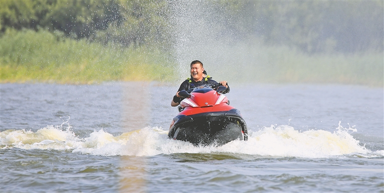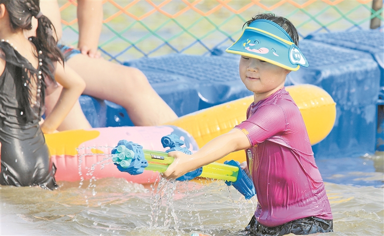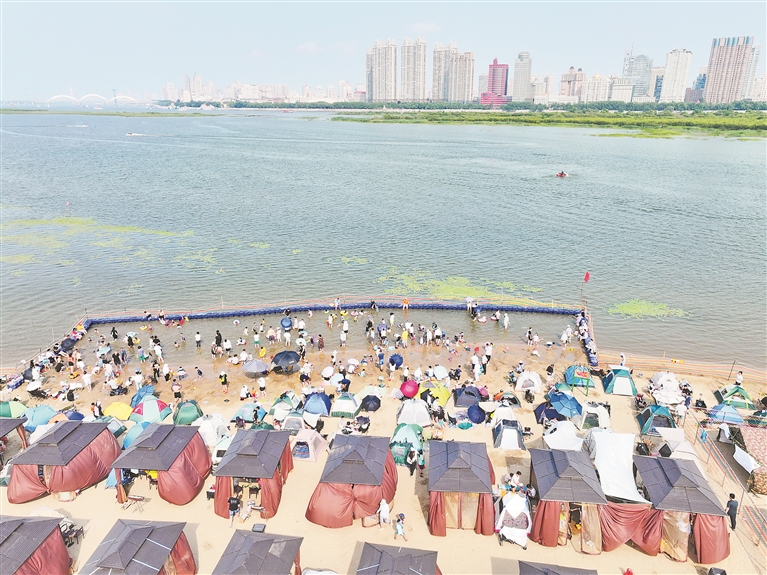 各個景區(qū)內(nèi),游客們撐起太陽傘,戴上遮陽帽,以抵御紫外線的照射。松花江畔的幾處浴場,人頭攢動,家長帶著孩子在這里戲水納涼。江邊的綠蔭里,滿是露營的帳篷,市民吃著冰西瓜、喝著涼啤酒,愜意地避暑。本報記者 張澍攝