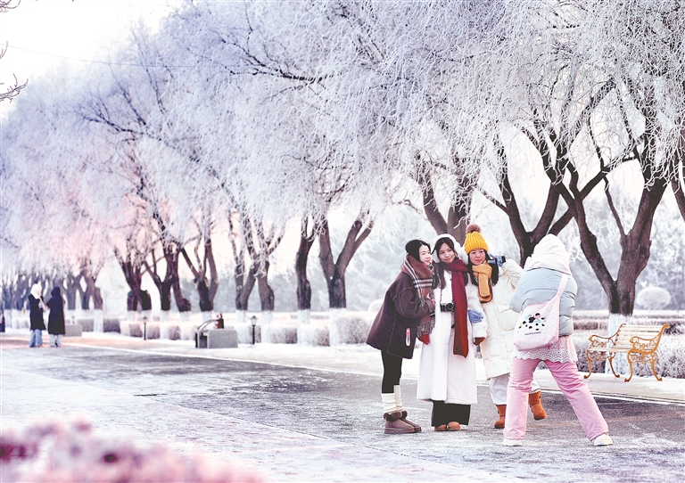 在松花江畔,一排排樹木都變成了白色,枝頭的冰晶反射著太陽的光芒,景色迷人,走入其中,仿佛置身于童話世界。游客們一邊觀賞霧凇美景,一邊用手機(jī)拍下精彩瞬間。