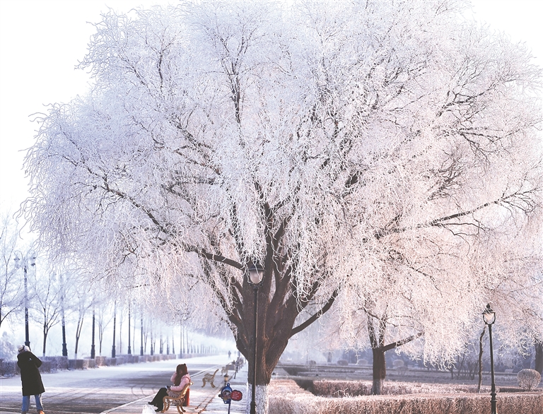 19日早晨,哈爾濱市許多地方出現(xiàn)霧凇景觀,城市被裝點(diǎn)得非常美麗。