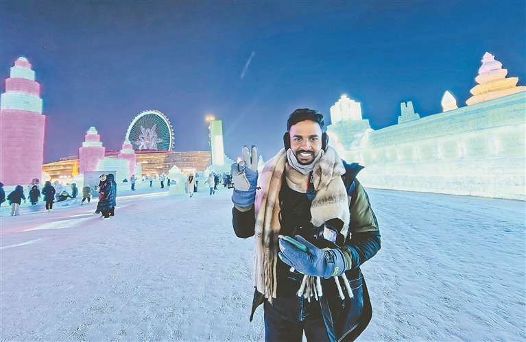 夜幕降臨,園區(qū)里五彩斑斕。徜徉其中,記者不時(shí)與遠(yuǎn)道而來的國際友人擦肩而過。印度游客庫洲倫一路走走停停,仿佛一位尋寶者,在冰雪編織的夢幻王國中盡情探索。他胸前挎著一臺單反相機(jī),手中握著手機(jī),眼中閃爍著滿滿的驚奇。每一次駐足,每一次與冰雕雪塑的凝視,都伴隨著按下相機(jī)快門的聲響。