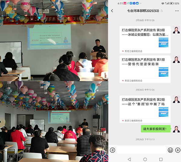 在此次打擊“代理退?!毙麄骰顒又校吲_河中支利用微信工作群、微信朋友圈轉發(fā)宣傳內(nèi)容,詳細剖析了黑灰產(chǎn)的常見運作模式,非法“代理退?!笨赡芙o消費者帶來的四方面風險:一是資金受損風險;二是喪失正常保險保障的風險;三是個人信息泄漏風險;四是相關行為可能導致消費者面臨訴訟等法律風險。號召廣大群眾增強風險防范意識,警惕非法“代理退?!碧茁?。