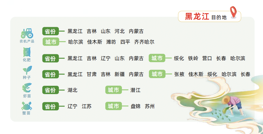 化肥和種子是春耕不可或缺的“糧食”。運(yùn)滿滿大數(shù)據(jù)顯示,運(yùn)往黑龍江的化肥產(chǎn)品主要來自東北三省以及山東、內(nèi)蒙古等地,黑龍江綏化、哈爾濱等地區(qū)在省內(nèi)化肥調(diào)配中發(fā)揮了重要作用,省外的鐵嶺、營口、長(zhǎng)春等地也積極輸送化肥。種子產(chǎn)品則來自黑龍江本地以及甘肅、吉林、新疆、內(nèi)蒙古等地,佳木斯、綏化、哈爾濱等地成為省內(nèi)種子供應(yīng)的樞紐,省外的張掖、長(zhǎng)春等地也為黑龍江春耕貢獻(xiàn)力量。