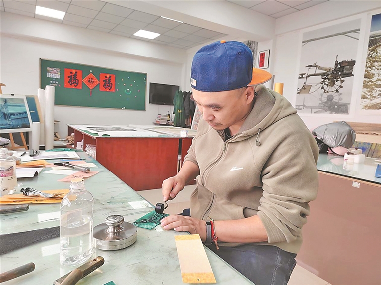 慶安版畫是黑龍江省非物質(zhì)文化遺產(chǎn)代表性項目,始于20世紀(jì)初。創(chuàng)始人吳盡臣將河北樂亭的木刻技藝帶到這片黑土地,最初以雕刻門神、福字等民俗圖案為主題,突出節(jié)日的喜慶和吉祥氣氛,表達(dá)人們對美好未來的企盼和追求。20世紀(jì)60年代中期,幾位著名的北大荒畫家到慶安工作,精心指導(dǎo)民俗年畫作者創(chuàng)作版畫,將慶安民俗版畫和北大荒版畫創(chuàng)作相互交融。歷經(jīng)四代傳承,吳蔚的父親吳玉林將題材拓展,用細(xì)膩刀法展現(xiàn)慶安的春播秋收、田園生活,在傳承中不斷創(chuàng)新;而吳蔚則把冰雪元素融入版畫創(chuàng)作,將千里冰封的壯美轉(zhuǎn)化為木板上的立體紋理?!袄献孀诹粝碌募妓嚥荒軄G,但作品題材和技法也要與時俱進(jìn),推陳出新?!眳俏当硎?,他們的創(chuàng)作團(tuán)隊不僅深入田間地頭、林海雪原采風(fēng),用刻刀記錄黑土地的獨特風(fēng)情,也緊盯時事熱點,呈現(xiàn)新時代的主流價值。