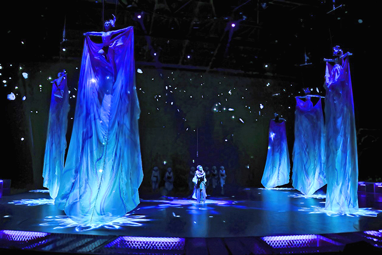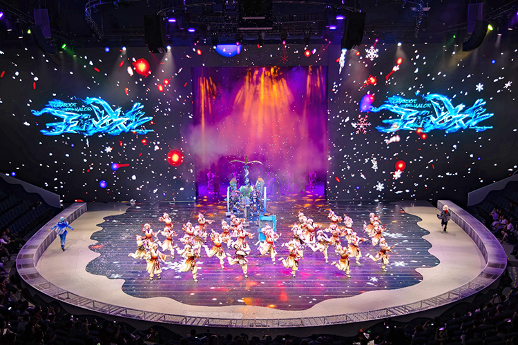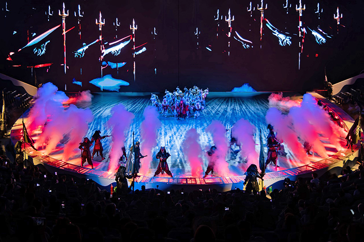 全新的演出以游戲玩家視角展開,當(dāng)游戲開始,巨大的環(huán)形地幕瞬間點亮,蒼茫的北境雪原鋪展開來,激光投影在穹頂交織出流動的光幕,與升騰的煙霧交融,千年前的部落場景躍然眼前。