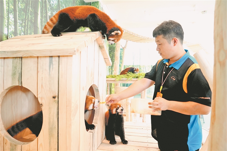 小熊貓是國家二級保護動物,野外種群數量不足萬只。保育員團隊精心準備小熊貓的飲食,專門從四川空運新鮮竹子并搭配多種營養(yǎng)餐食,確保小熊貓們健康成長。本報記者 董廣碩攝