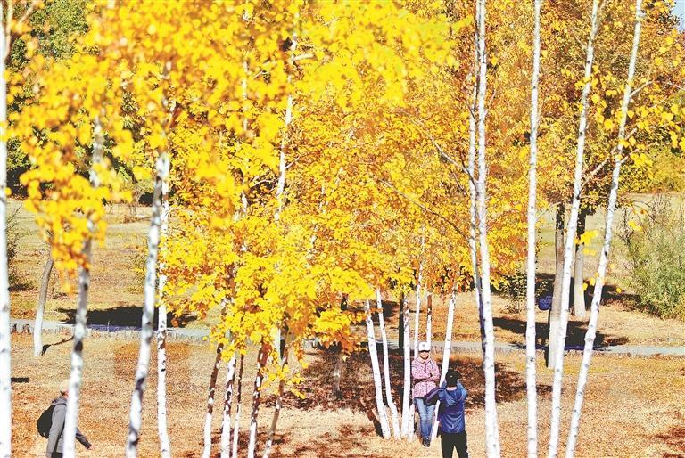 12日,哈爾濱市道里區(qū)麗江路附近的松花江畔,一小片白樺林吸引人們駐足觀(guān)賞、拍照。深秋的白樺樹(shù),樹(shù)干筆直高聳,樹(shù)皮潔白如紙。枝頭的葉子已經(jīng)由綠色變成了金黃色,在陽(yáng)光的照耀下,色彩濃重,景色迷人。本報(bào)記者 蘇強(qiáng)攝