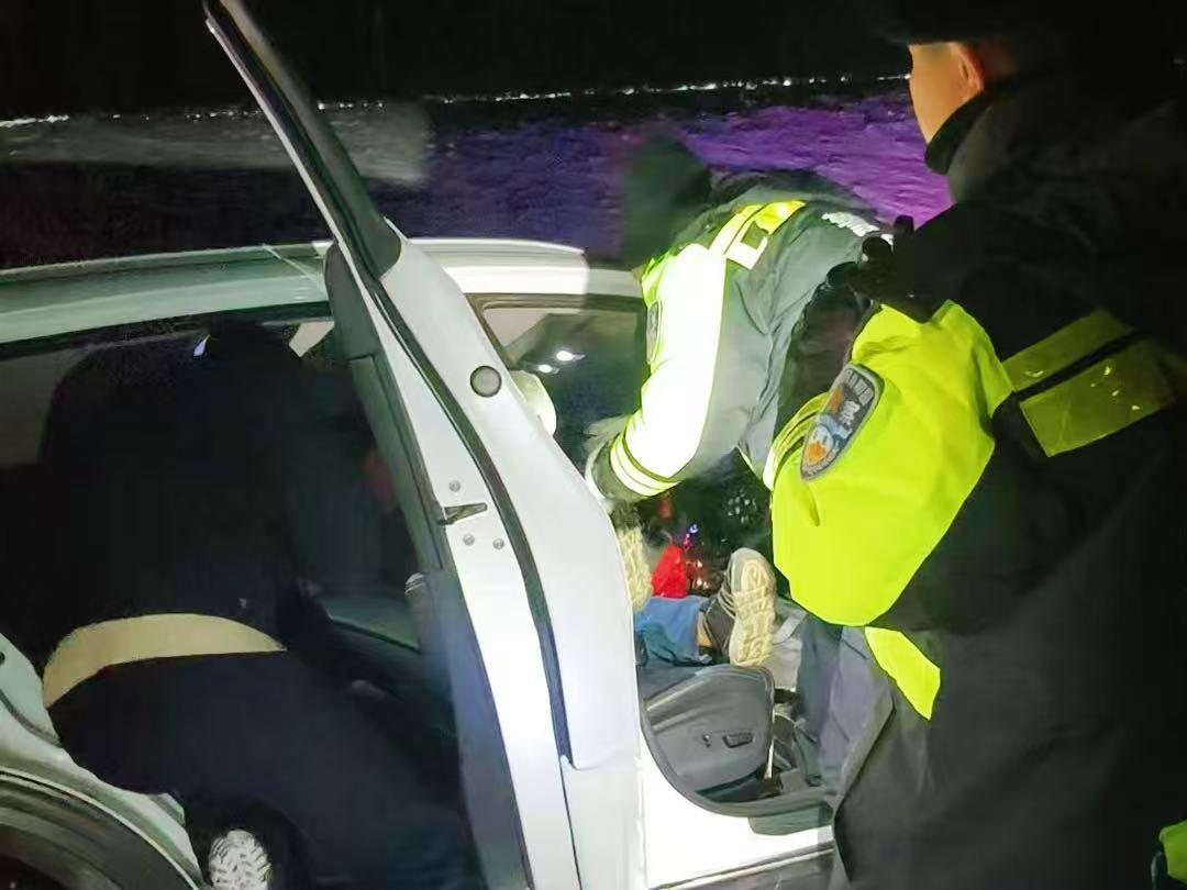 抵達現(xiàn)場后,民輔警第一時間查看被困人員狀態(tài),通過簡單詢問,確認無人員受傷,隨即立刻展開低溫救援,由于溝坡陡滑,常規(guī)救援設備無法使用。民輔警毫不猶豫地滑下溝底,并迅速從副駕駛展開救援,經(jīng)過不懈努力,十分鐘后成功將被困人員從車內(nèi)救出。隨后,民輔警主動幫助聯(lián)系拖車公司將車輛送至維修廠檢修,并用警車將游客接回派出所安置。抵達白銀納派出所后,值班輔警遞出早已準備好的熱水和蛋糕。“溫度達到零下36℃,手機凍得即將關(guān)機,還好有人民警察幫忙,不然真的不知道該怎么辦了。”被救助群眾感激的說道。