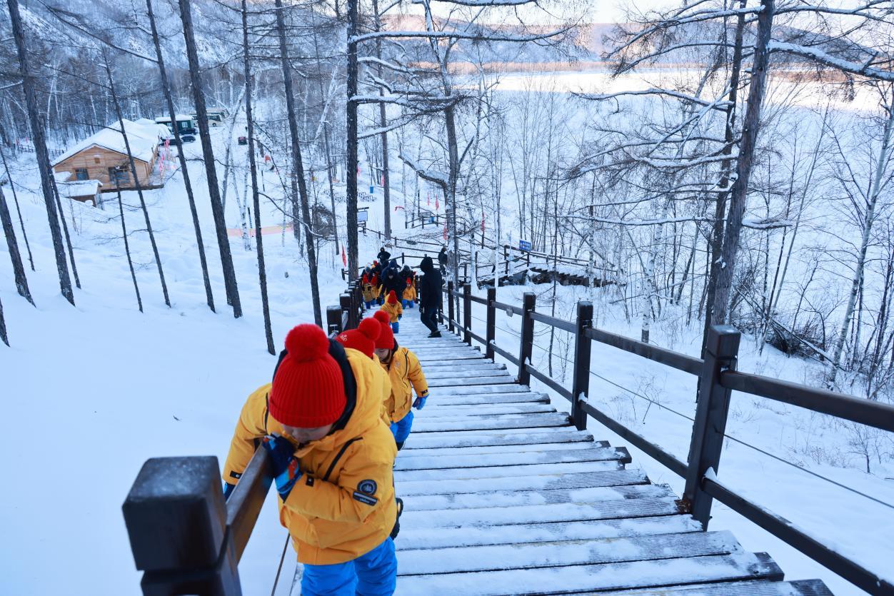 孩子們排成一串靈動的小隊,踩著積雪在棧道上噠噠前行,腳下“咯吱咯吱”的清脆聲響,為這場研學之旅奏響歡快序曲。軟糯的廣西口音此起彼伏,孩子們或好奇地觸摸棧道積雪,冰涼的觸感讓他們瞇起眼睛直跺腳;或緊緊抓著欄桿,任憑小臉凍得通紅,仍目不轉睛眺望遠方“Ω”形的冰封江灣,沉浸式感受北國冰雪的奇妙。那一抹抹跳動的橘色,在純白世界中宛如一團團小火苗,格外耀眼。
