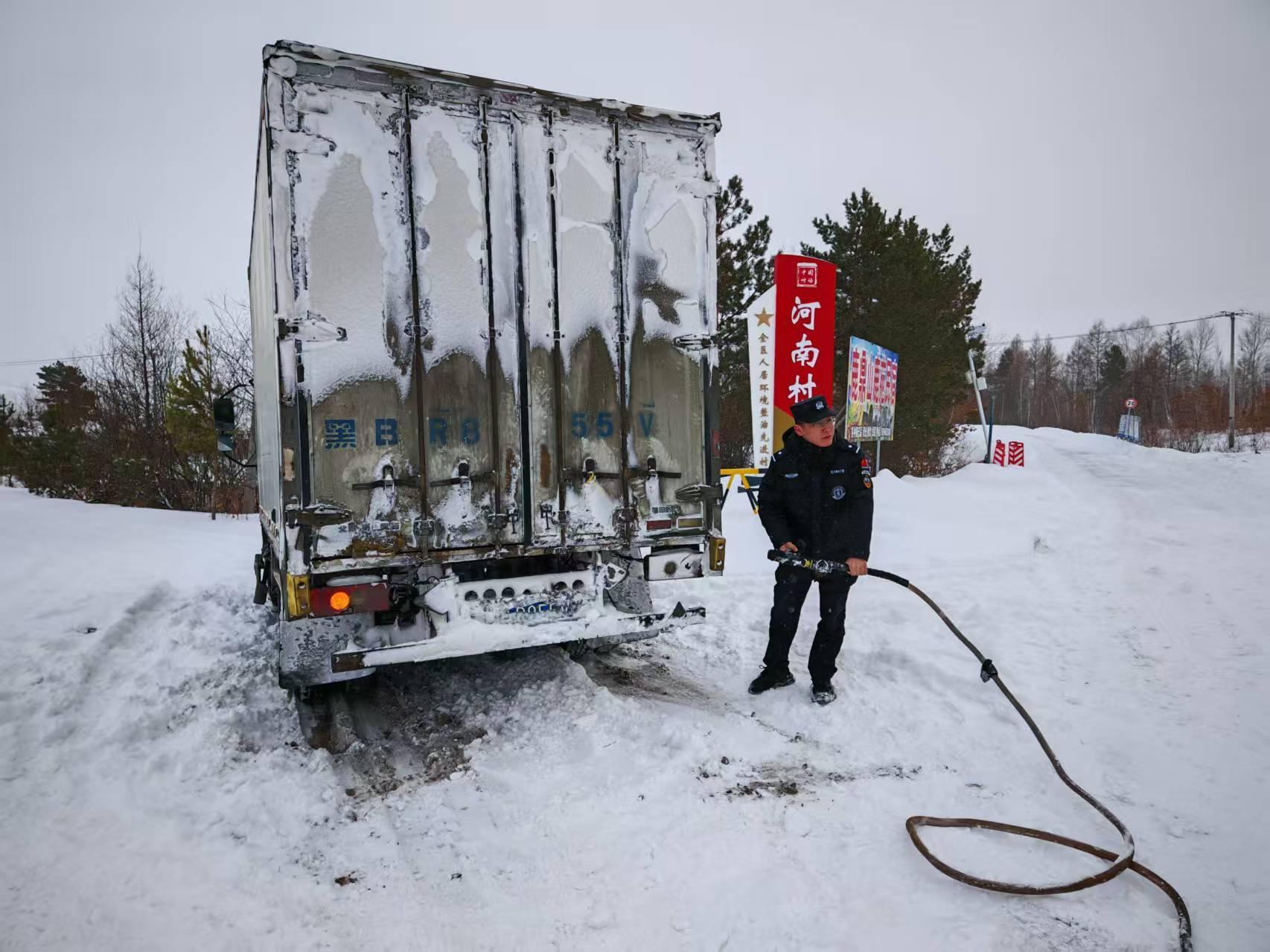 交警大隊(duì)接到G331國(guó)道河口執(zhí)勤點(diǎn)求助稱有一輛廂式貨車因積雪過厚、路面濕滑、不慎陷于深雪中無法移動(dòng),導(dǎo)致車輛被困。