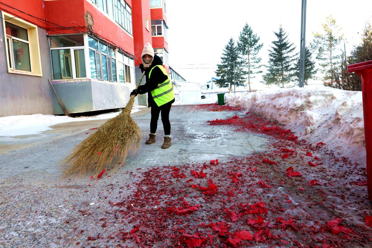 2月16日8點(diǎn),大街小巷年味正濃,鞭炮紙屑散落各處,行人寥寥。身穿黃馬甲的林業(yè)局環(huán)衛(wèi)工人已穿梭在街頭,帽子、睫毛凝滿白霜,手中掃帚不停揮舞,將鞭炮碎屑、生活垃圾及時(shí)清掃歸堆、裝車清運(yùn)。轉(zhuǎn)崗環(huán)衛(wèi)工人馬建民說:“我的責(zé)任區(qū)內(nèi)商戶多、居民多,春節(jié)期間工作量比平時(shí)多一倍,必須打掃干凈,讓大家過個(gè)舒心年?!痹谌w保潔員的奮戰(zhàn)下,居民區(qū)實(shí)現(xiàn)鞭炮紙屑隨放隨清、生活垃圾日產(chǎn)日清,大街小巷始終整潔有序。