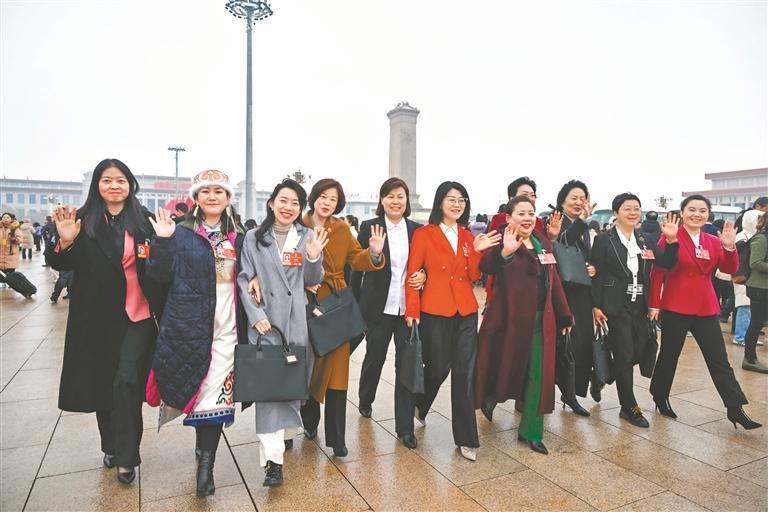 全國兩會期間,參加十四屆全國人大四次會議的黑龍江女代表意氣風(fēng)發(fā)步入會場。