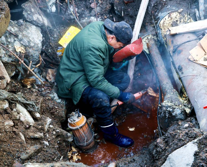 搶修現(xiàn)場(chǎng),機(jī)械與人力協(xié)同發(fā)力。小型挖掘機(jī)破土作業(yè),挖開近2米深的作業(yè)面,精準(zhǔn)定位蒙板漏水點(diǎn)。10余名搶修人員腳穿水靴,一邊操作水泵排水,一邊用鍬鎬擴(kuò)大作業(yè)空間,爭(zhēng)分奪秒推進(jìn)搶修進(jìn)程。為搶抓進(jìn)度,搶修人員放棄午休和周日休息,全程堅(jiān)守一線,先后完成開口、安裝臨時(shí)閥門等關(guān)鍵工序,待供暖主管水凈后,迅速開展焊接作業(yè),精準(zhǔn)修復(fù)10多公分長(zhǎng)的破裂處,最終完成焊接、保溫及現(xiàn)場(chǎng)恢復(fù)工作。