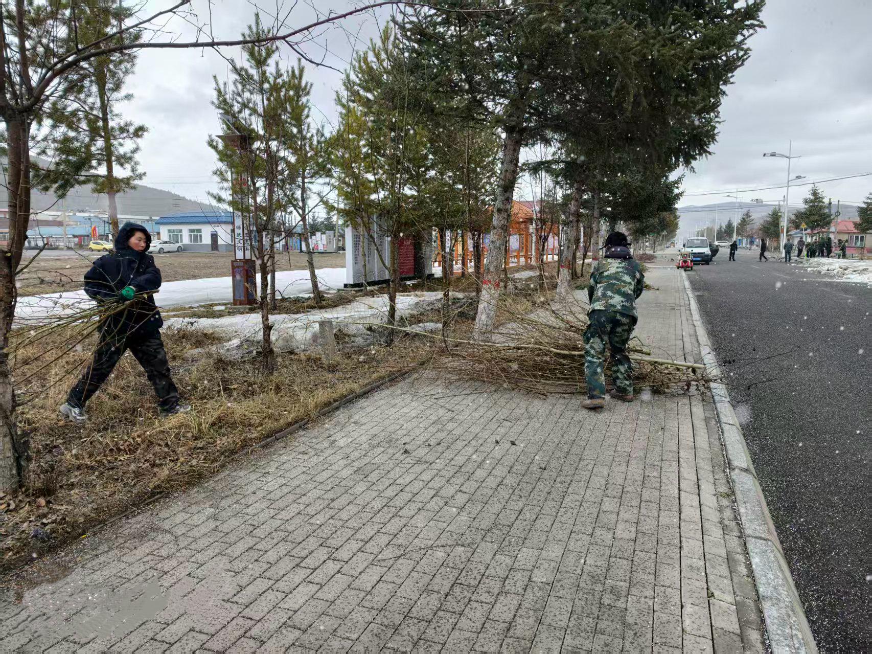 行動中,林場全體干部職工20余人對分擔(dān)區(qū)內(nèi)裸露的白色垃圾、雜物雜草等進行了全面的清理。寒風(fēng)里,義務(wù)勞動的現(xiàn)場一片熱火朝天。同志們手持工具,分工協(xié)作、干勁十足。有的揮動鐵鎬,刨開凍硬的積雪,一鎬一鑿鏗鏘有力;有的手持鏟鍬,將碎雪與雜物歸攏成堆,動作麻利有序。在道路兩側(cè)的綠化帶內(nèi),割灌機轟鳴作響,清理雜亂枝杈,讓林木整齊舒展;手持耙子的同志俯身勞作,細細摟凈地面雜草枯葉,清出一片整潔林地。裝車現(xiàn)場更是繁忙,眾人合力將枯枝、雜物、積雪塊搬運裝車,此次環(huán)境衛(wèi)生大清理,共清運各類垃圾、積雪10余車。